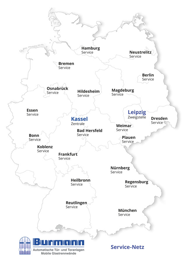Mit unserer Zentrale in Calden bei Kassel, der Niederlassung in Leipzig und zahlreichen weiteren Service-Standorten sind wir deutschlandweit schnell für Sie im Einsatz. Unsere erfahrenen Serviceteams sorgen für kurze Reaktionszeiten, zuverlässige Abläufe und eine fachgerechte Betreuung Ihrer Anlagen.